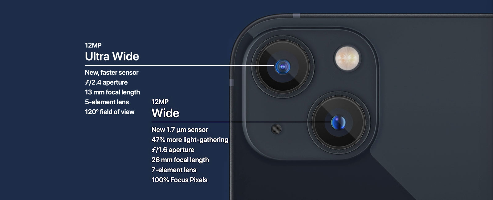 گوشی موبایل اپل iPhone 13 از یک سنسور 12 مگاپیکسلی برای دوربین سلفی و دو سنسور 12 مگاپیکسلی واید و اولترا واید برای دوربین اصلیِ خود بهره می برد. این دوربین ها، نویز کمتر و نور بیشتری را ثبت می کنند. در نتیجه، تصاویر بسیار با کیفیت و شفافی را برای مخاطب به ارمغان می آورند.