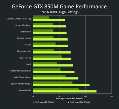 GeForce GTX 850Mجزو معدود گرافیکهایی است که با تکنولوژی Maxwell ساخته شده اند که طبق ادعای کمپانی Nvidia، میتواند تا 90% از تکنولوژی قبلی که Kepler نام داشت، عملکرد بهتری داشته باشد. بسیاری از بازیهای سال 2013 و 2014 به راحتی با این کارت گرافیک و با کیفیت دقت تصویر Full HD قابل اجرا هستند. بازیهایی مانند Tomb Raider و یا BioShock با بالاترین تنظیمات گرافیکی، با این دقت نمایش، بسیار روان اجرا میشوند. اگرچه بازیهای محبوبی مانند Crysis 3 و یا Battlefiled 4 نیازمند چنین دقت تصویر و یا تنظیمات گرافیکی بالایی نیستند. در تصویر زیر، تفاوت عملکرد پردازنده گرافیکی GTX 850M را با GT 750M در بازی های مختلف مقایسه می کنیم. |
