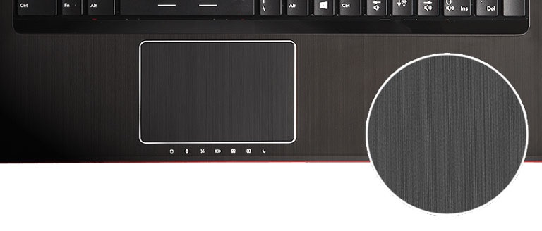در میان محل استراحت دستها که از جنس پلاستیک با طرح آلومینیوم برس خورده است و اثر انگشت کمی را جذب میکند، تاچ پد مشکی نسبتا بزرگ با لبه های فرو رفته نقره ای رنگ قرار گرفته است. کلیدهای تاچ پد در داخل بدنه مخفی شده اند و سطح انعطاف پذیر تاچ پد در هنگام فشردن این کلیدها فرو میرود که در این هنگام شما میتوانید دیواره قرمز رنگ داخل بدنه تاچ پد را نیز مشاهده کنید. حساسیت تاچ پد بالا است و همچنین از فرمانهای چند لمسی نیز پشتیبانی میکند. لغزندگی تاچ پد نیز مناسب است و انگشتها بر روی سطح آن به راحتی سر میخورند.