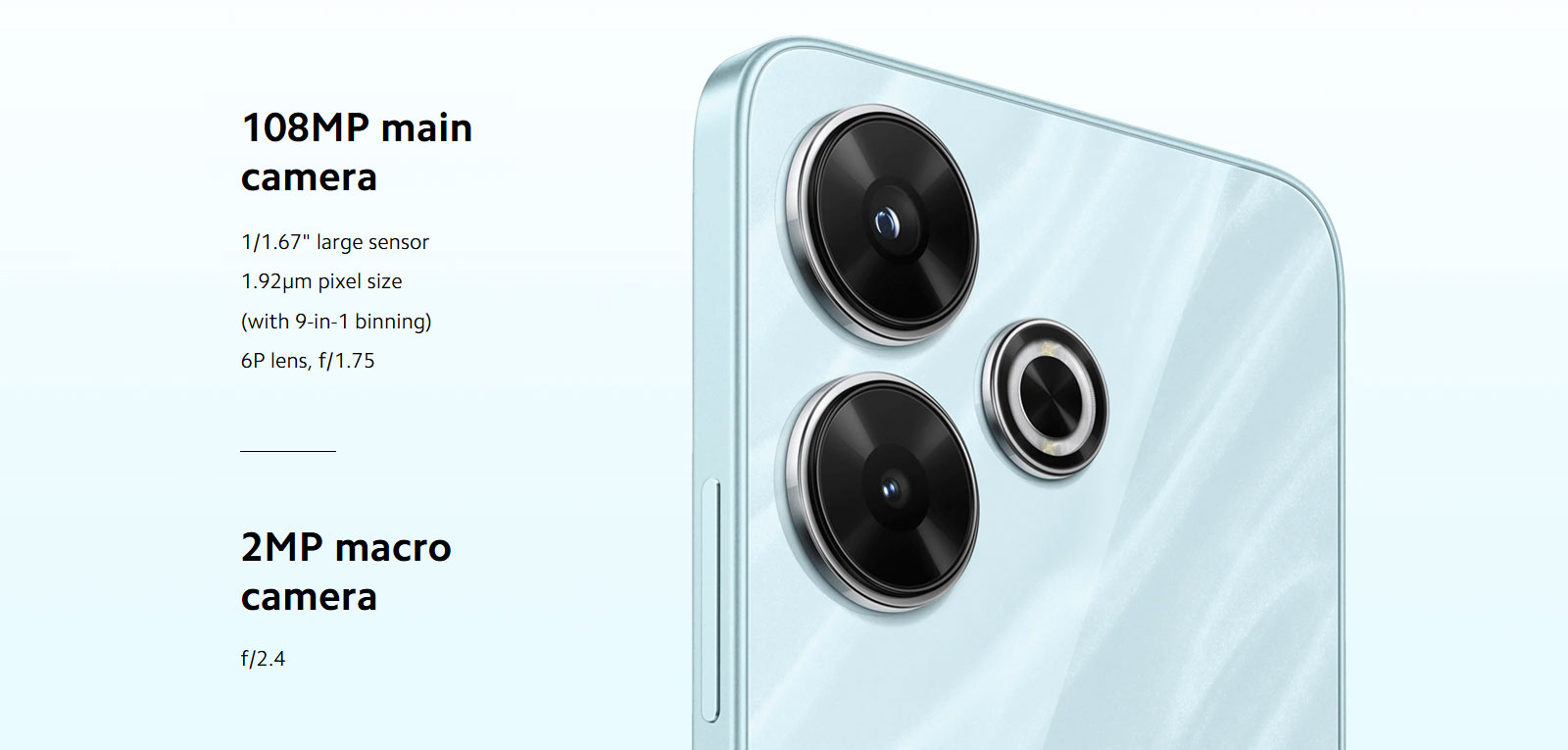 یک دوربین ۱۰۸ مگاپیکسلی بر روی گوشی ردمی ۱۳ قرار گرفته است. این دوربین علاوه بر نور روز هنگام کاهش نور محیط نیز عملکردی قابل قبول به اجرا می گذارد.